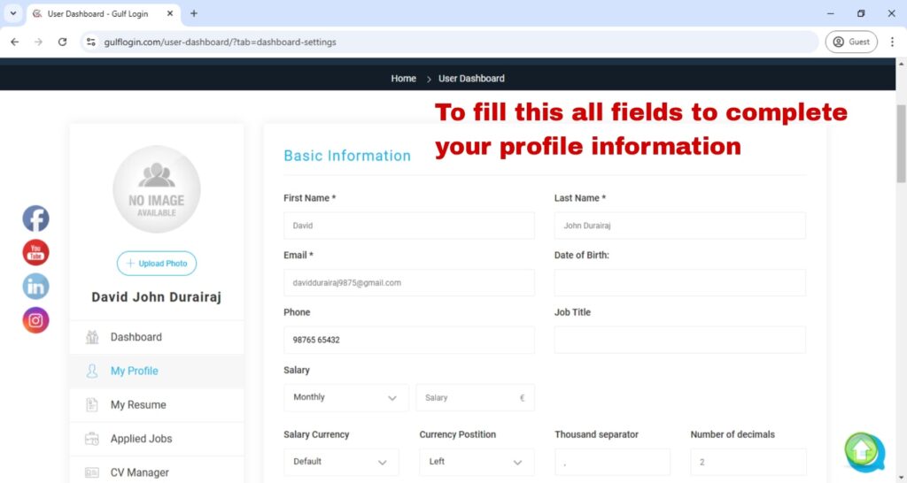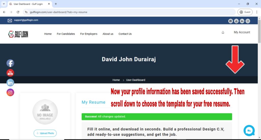 After you click this Save Settings button, then your profile information is successfully saved. Now you are redirecting to My Resume page for create your own free resume.