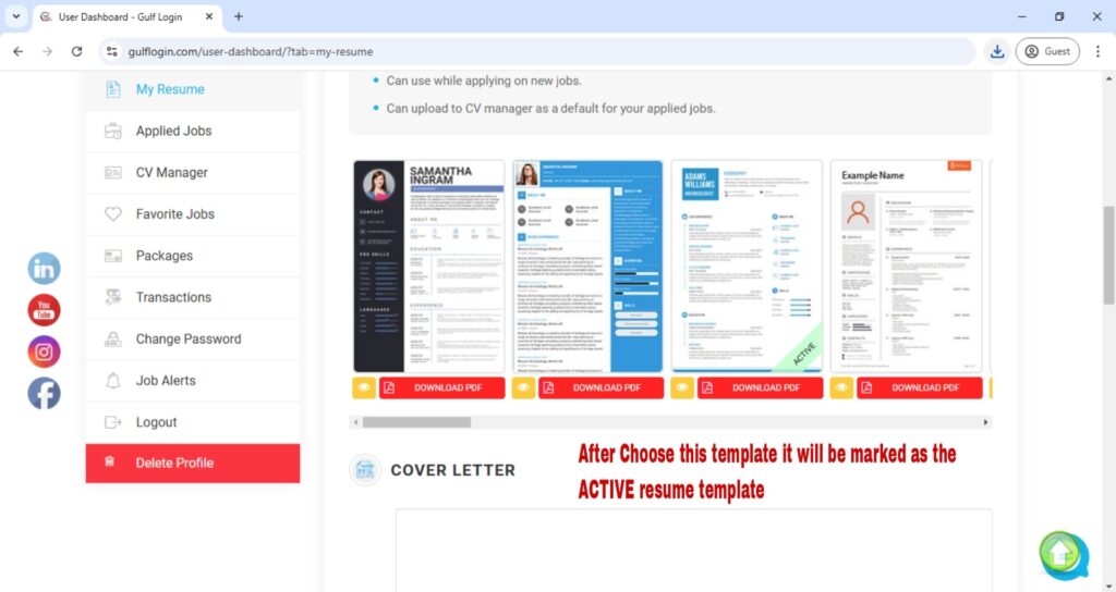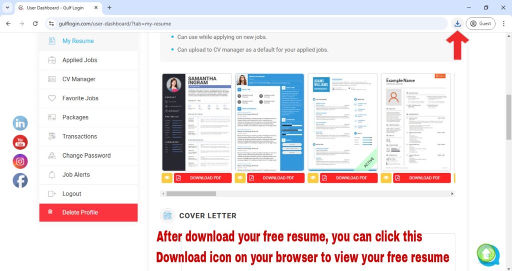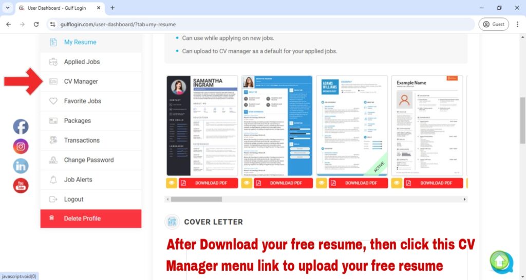 After download your free resume, then click the CV Manager menu link on your candidate dashboard to upload your free resume.
