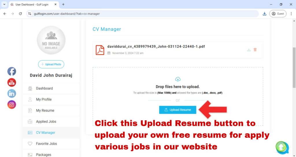 After you click the CV Manager menu link, then click this Upload Button to upload your free resume for applying various jobs in our website.