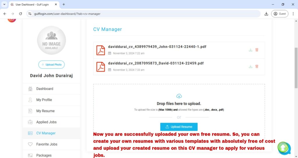 Now you are successfully uploaded your own free resume. So, you can create your own resume with various templates with absolutely free of cost and upload your created resume on this CV Manager to apply for various jobs.