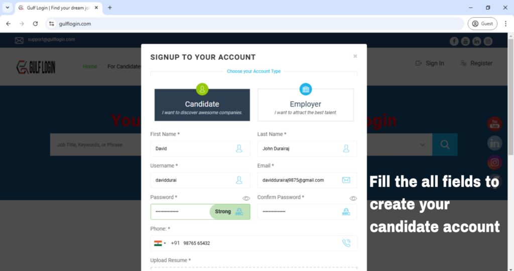 Step 2 : To fill this all required fields in a Candidate Sign Up form.