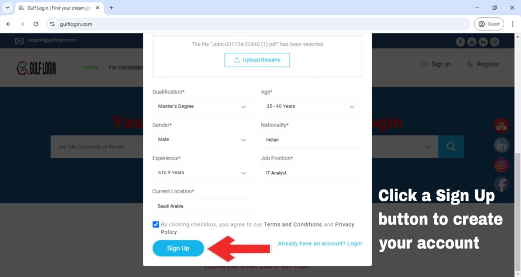 After you fill the fields such as First name, Last Name, Username, Email, Password, Phone Number, Upload Resume, Qualification, Age, Gender, Nationality, Experience, Job Position, Current Location and by accept the Terms and Privacy Policy. Then, you click a Sign up button to create your free Candidate account.
