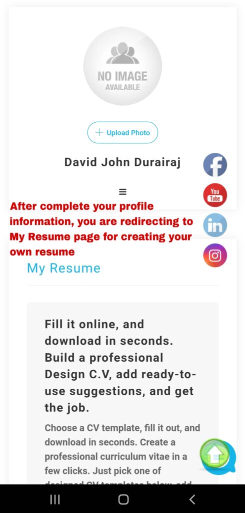 After you click this Save Settings button, then your profile information is successfully saved. Now you are redirecting to My Resume page for create your own free resume.