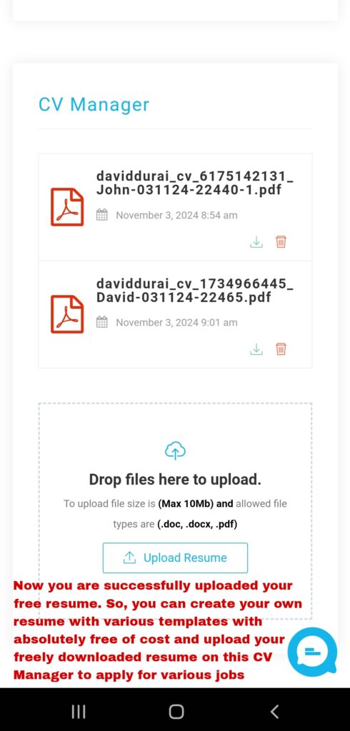 Now you are successfully uploaded your own free resume. So, you can create your own resume with various templates with absolutely free of cost and upload your created resume on this CV Manager to apply for various jobs.