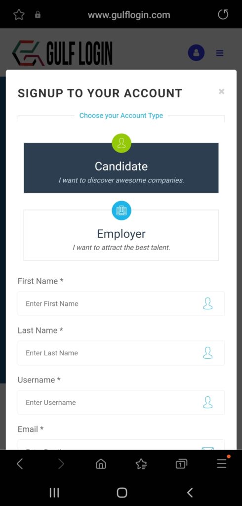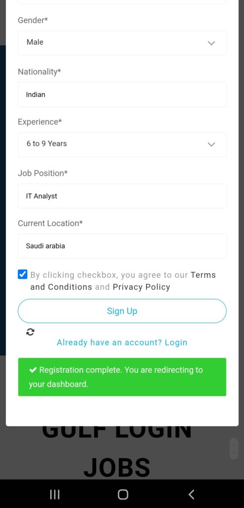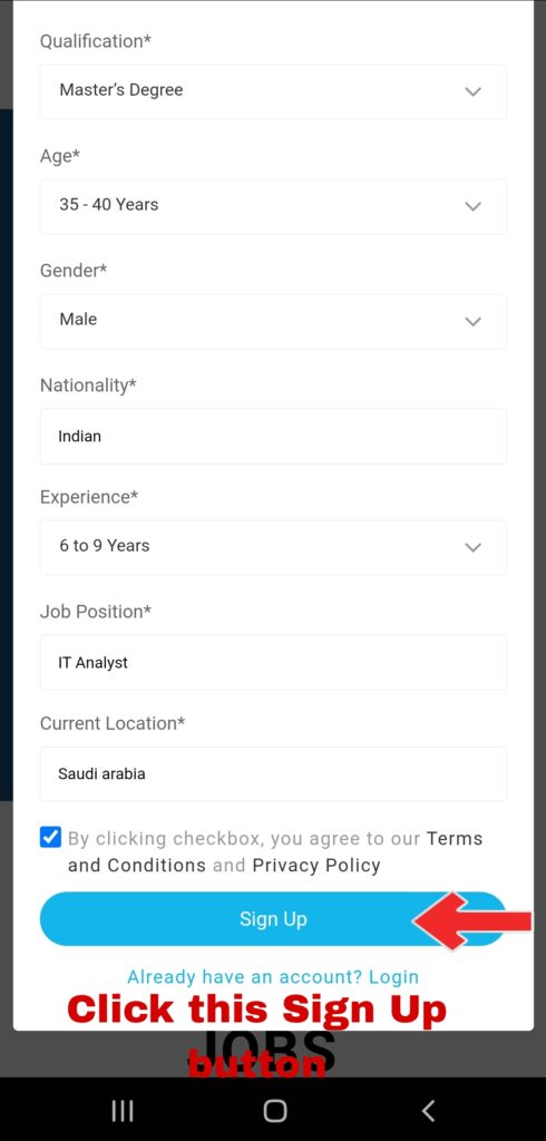 After you fill this required fields such as First name, Last Name, Username, Email, Password, Phone Number, Upload Resume, Qualification, Age, Gender, Nationality, Experience, Job Position, Current Location and by accept the Terms and Privacy Policy. Then, you a click Sign up button to create your free Candidate account.